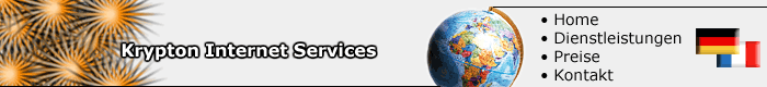 Krypton Internet Services - Internet Services Provider seit 1997 Wir verfügen über sehr schnelle und professionell gewartete Power-LINUX-Server. Durch unsere Mehrfachanbindung zum Backbone mit 100 Mbps Durchsatz und Verfügbarkeit von über 99,9% gehören wir zu den schnellsten und stabilsten Providern weltweit. ADSL in Liechtenstein. Immer online ab nur CHF 47.90 pro Monat ! Hosting Aufschaltung Ihrer Homepage, e-Commerce-Website, Betrieb von e-mail-Servern.  |